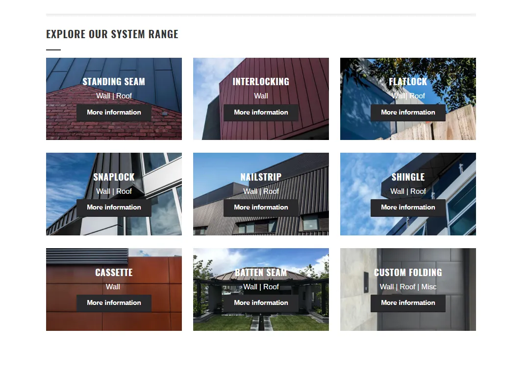 It can be difficult for non-industry to understand metal cladding system names, performance benefits, and aesthetic attributes. The ‘Systems’ page on our website provides a clear, concise overview of each profile by presenting a grid layout with names, application suitability (roof, wall or roof and wall), and an image of the product in-situ. Click on a system square to discover more information, access data sheets, and view more project applications.