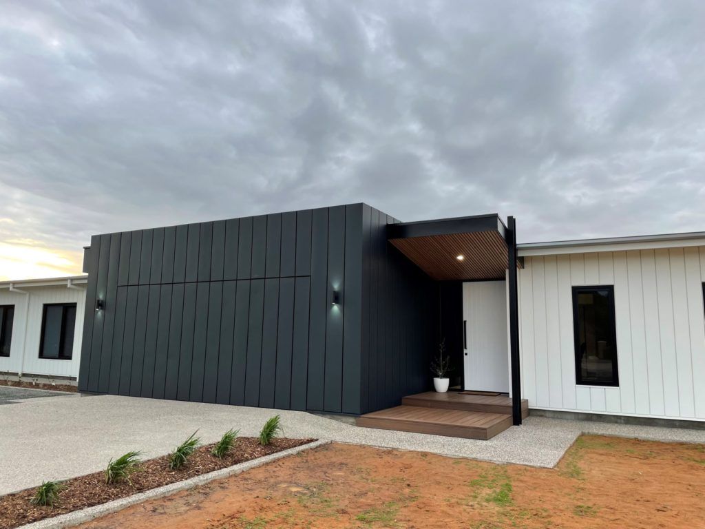 Garage door cladding can be more prone to oil-canning compared to fixed wall panels. Movement in the operable door can increase the likelihood of visible pillowing. Oil-canning is rarely a product or installation flaw (read more on oil-canning here) and some materials are less likely to present visible oil-canning. Light colours are less likely than dark colours to oil-can, and textured products such as Colorbond Steel Matt and Vestis Nebula aluminium are less reflective and therefore less likely to oil-can.