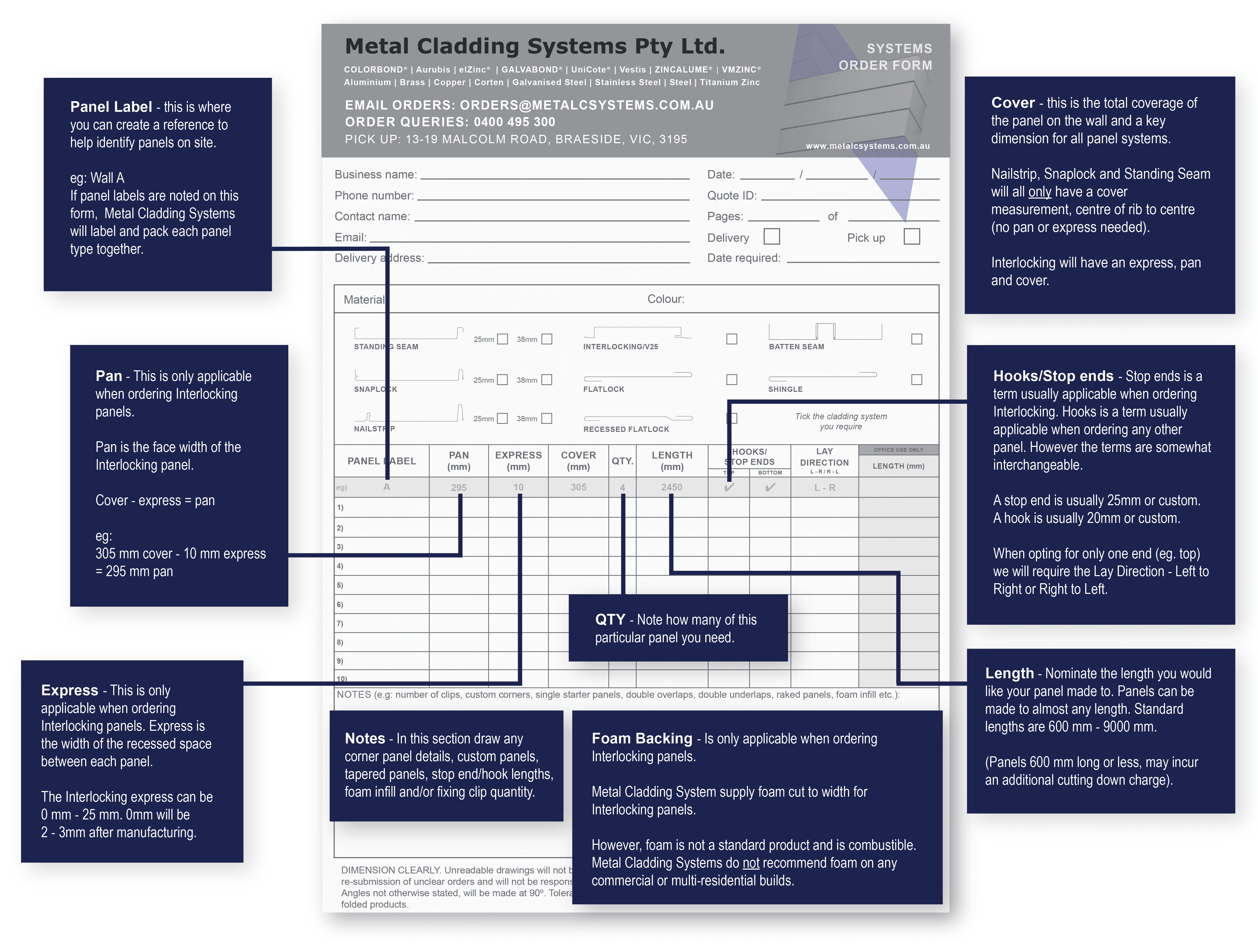 Once an order form has been completed it’s time to submit the order to Metal Cladding Systems for processing. Scan or photograph your completed order form and email it to orders@metalcsystems.com.au. Before sending, check the following:
